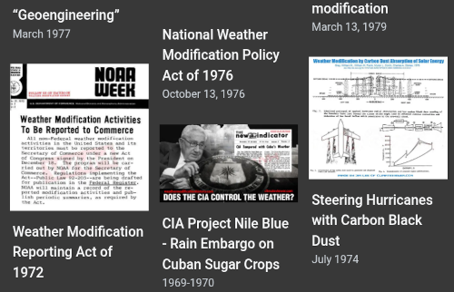 Each event in this timeline contains descriptions, quotes, images, videos, and references divided into three main categories: Geoengineering; Weather Modification; and Space Weather Modification.